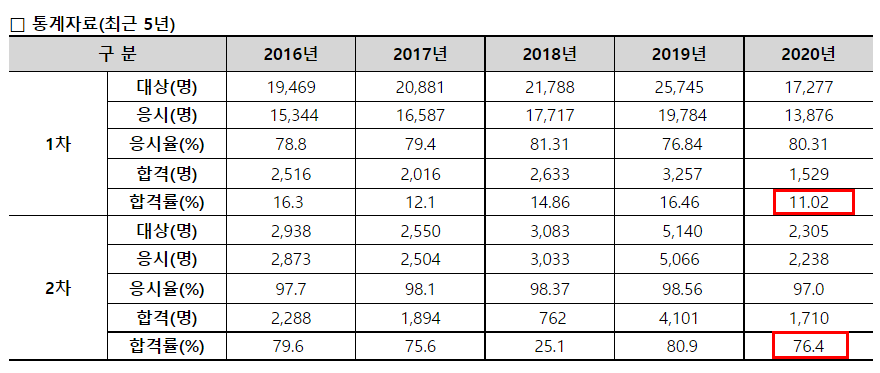 2020년 시험 합격률을 보면 1차는 약 11%이고 2차는 약 76%인 것을 확인할 수 있습니다. 1차 시험 합격률이 2차 대비 매우 낮은 수준이기 때문에 주택관리사 1차 시험 합격이 가장 큰 고비라고 볼 수 있겠습니다.