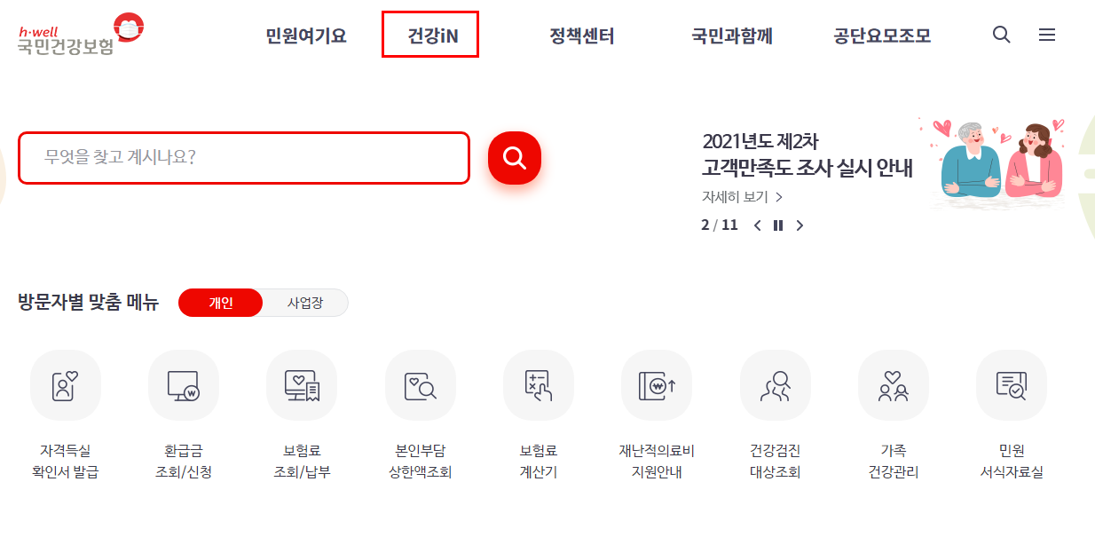 홈페이지 상단에 보이는 건강in이라는 항목을 선택해주세요.