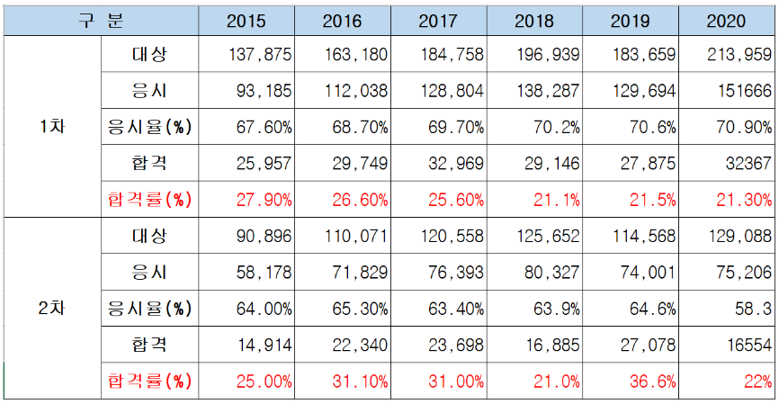 하지만 합격자는 전체 응시자의 20~30% 수준이기 때문에, 최소한 상위 20% 실력 안에 들어가야 1년 이내에 합격을 하고 나올 가능성이 있다고 보시면 됩니다.