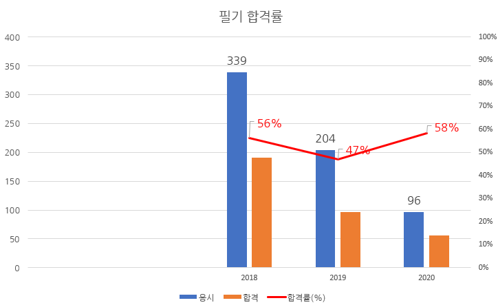 최근 3년 필기시험 합격률을 차트로 정리해 보면 다음과 같습니다.