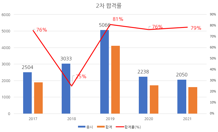 최근 5년 2차 시험 합격률을 차트로 정리해 보면 다음과 같습니다.