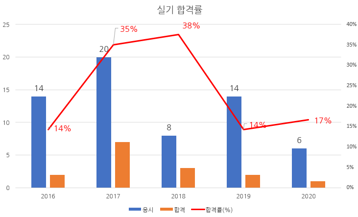최근 5년 실기시험 합격률을 차트로 정리해 보면 다음과 같습니다.