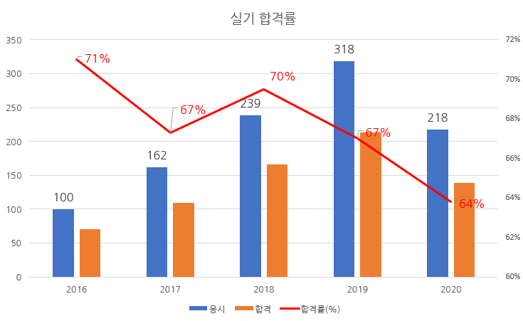 최근 5년 실기시험 합격률을 차트로 정리해 보면 다음과 같습니다.