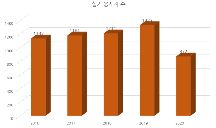 최근 5년 실기시험 응시자 수를 차트로 정리해 보면 다음과 같습니다.