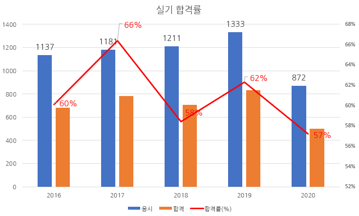 최근 5년 실기시험 합격률을 차트로 정리해 보면 다음과 같습니다.