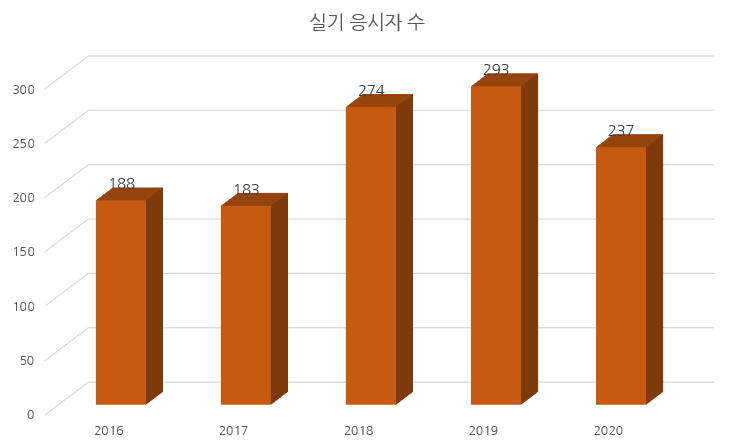 건설기계정비산업기사 실기 응시자 수는 2016년 188명, 2017년 183명, 2018년 274명, 2019년 293명, 2020년 237명입니다.