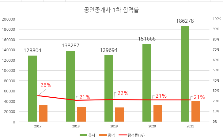 공인중개사 1차 시험의 경우 평균 20% 초반대를 유지하고 있습니다. 매년 응시자 10명 중 2명 정도가 합격을 할 수 있으며, 초록색으로 표시된 응시자 수를 확인해보면 점차 증가하고 있는 것을 확인할 수 있습니다.