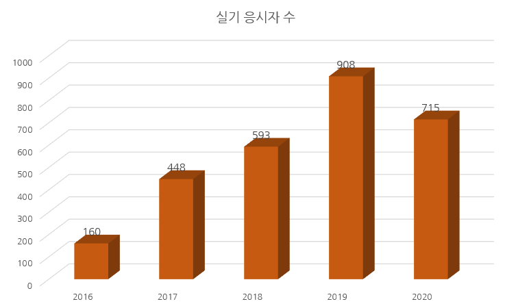 최근 5년 실기시험 응시자 수를 차트로 정리해 보면 다음과 같습니다.