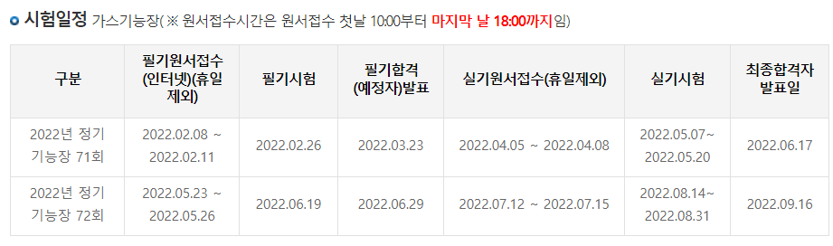 가스기능장 자격시험은 1년에 아래와 같은 회차로 시행하고 있습니다. 구체적인 날짜와 원서 접수 일정은 다음과 같습니다.