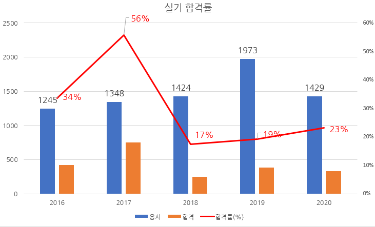 최근 5년 실기시험 합격률을 차트로 정리해 보면 다음과 같습니다.