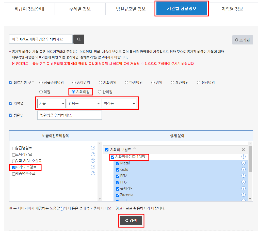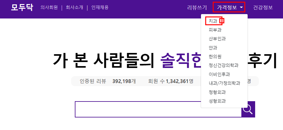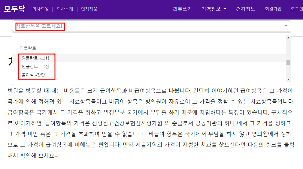 2. 가격정보 클릭 후 치과 선택