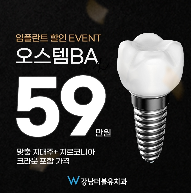 강남 w치과에서는 오스템 BA, 디오 임플란트를 59만 원에 제공하고 있으며, 맞춤 지대주와 지르코니아 크라운이 무료로 포함되어 있는 가격입니다. 전체 임플란트는 악당 기준으로 700만 원에 제공하고 있으며 픽스처 8개와 상악동 거상술, 뼈이식 비용 추가가 없는 것으로 알고 있습니다.