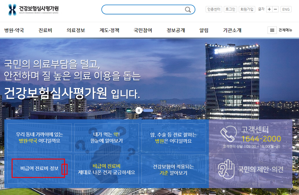 2. 홈페이지 하단 목록에서 비급여 진료비 정보를 선택합니다.