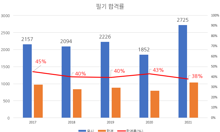 최근 5년 필기시험 합격률을 차트로 정리해 보면 다음과 같습니다.
