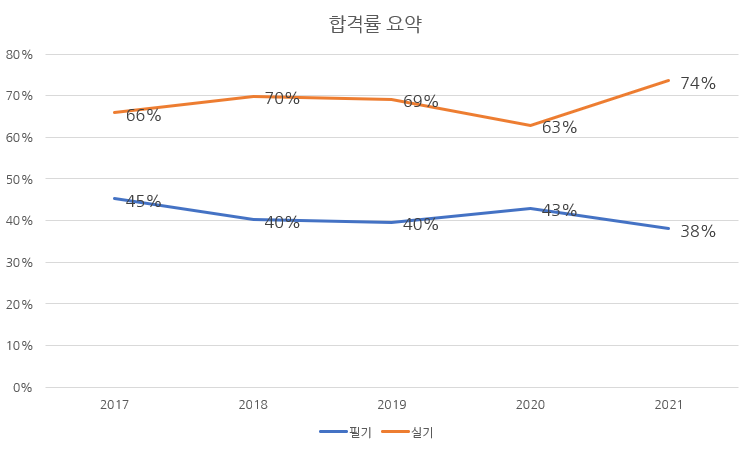 최근 5년 실기시험 합격률을 차트로 정리해 보면 다음과 같습니다.