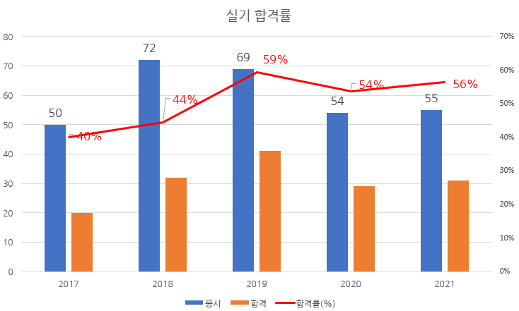 최근 5년 실기시험 합격률을 차트로 정리해 보면 다음과 같습니다.