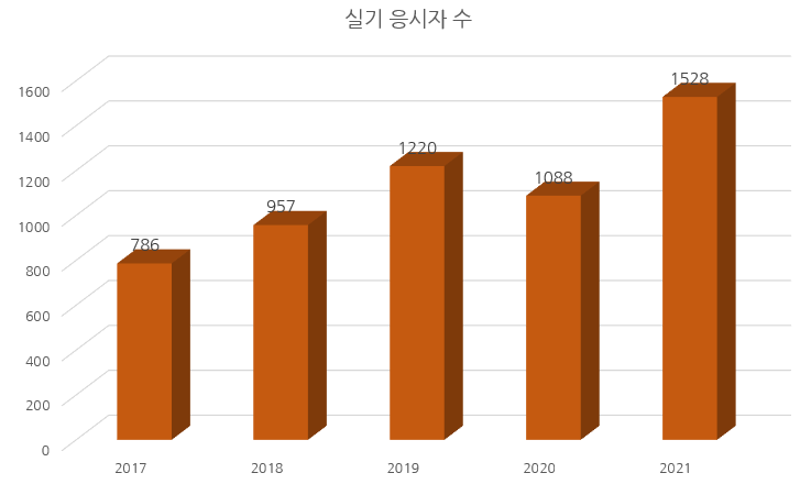 최근 5년 실기시험 응시자 수를 차트로 정리해 보면 다음과 같습니다.