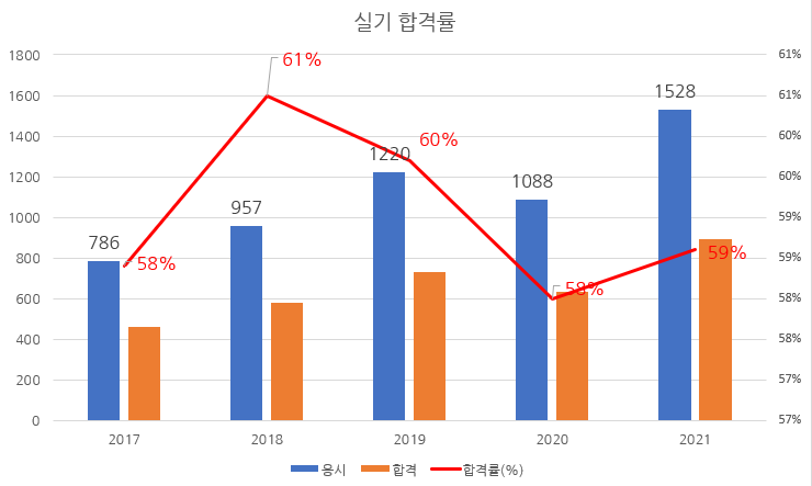 최근 5년 실기시험 합격률을 차트로 정리해 보면 다음과 같습니다.