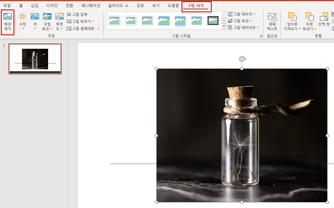 그림을 누르면 화면 상단에 <그림 서식>이라는 단추가 활성화됩니다. 단추를 누른 다음 <배경 제거>를 선택합니다.