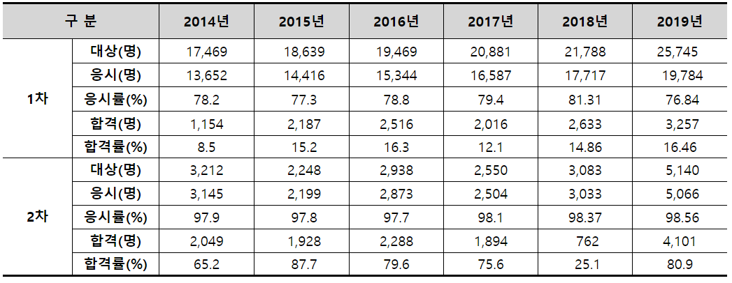 큐넷에서 제공한 2014년~2019년 합격률 자료입니다. 1차 시험은 10프로 중반의 합격률 선을 유지했으며 2차는 70~80% 선을 유지한 것으로 확인됩니다. 2018년 2차 시험의 합격률이 25.1프로로 몹시 저조한데, 이유는 시험 난이도 조절 실패로 확인됩니다.