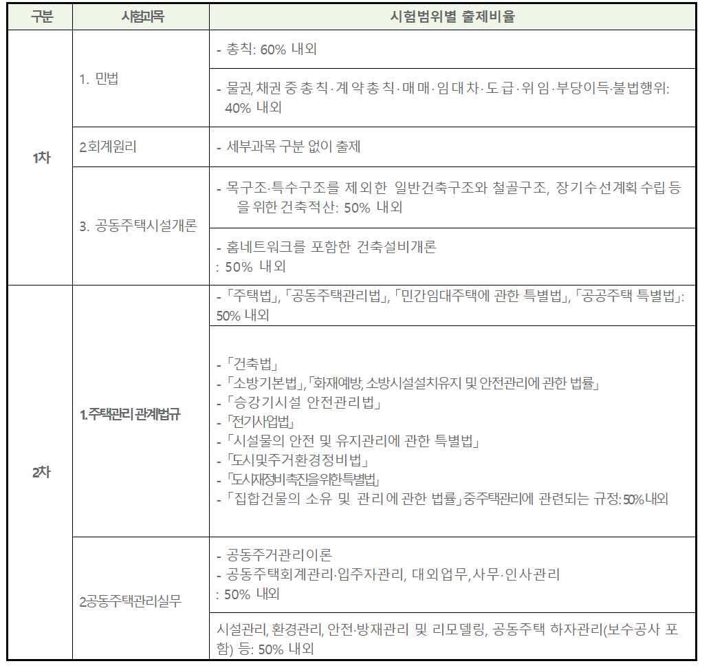 - 2차 시험과목 : 주택관리사 법규, 공동주택 관리 실무