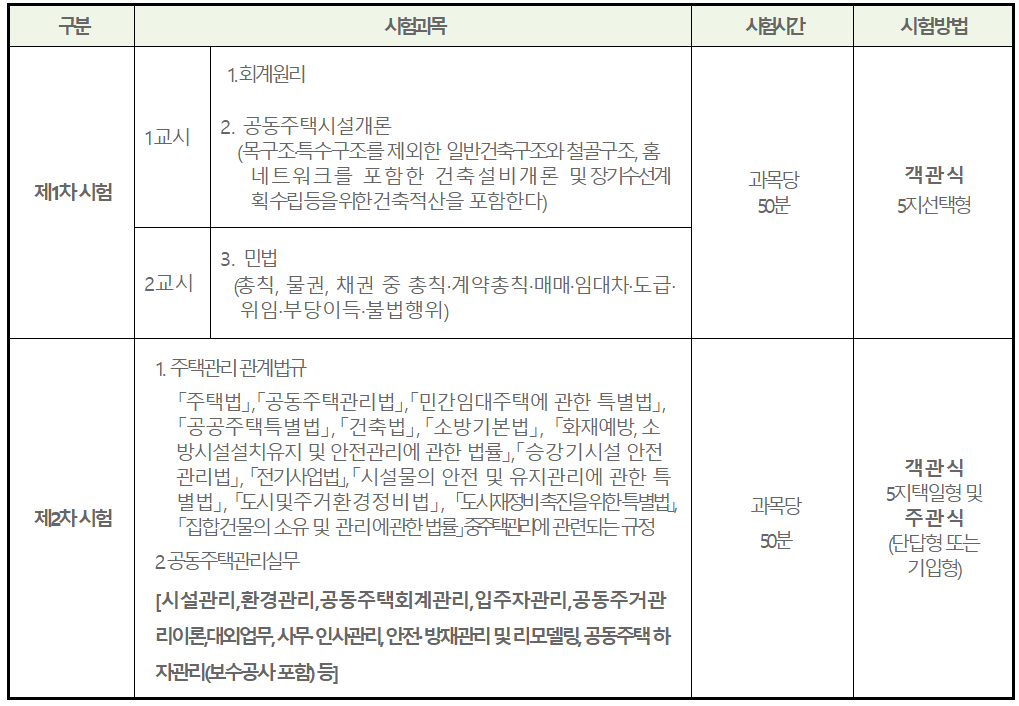 - 1차 시험과목 : 회계원리, 공동주택시설개론, 민법
