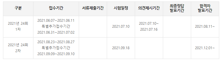 1차 시험 접수는 2021.06.07 ~2021.06.11에 진행되고 2021.07.11에 시험을 치르게 됩니다. 시험 접수 후 약 한 달이 지난 다음 시험을 보게 되는 것입니다. 1차 시험에 대한 합격자 발표는 2021.08.11입니다.