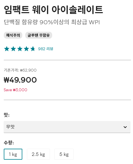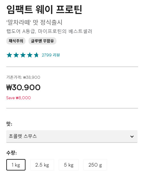 마프 임팩트 웨이 프로틴은 마이프로틴의 꾸준한 사랑을 받고 있는 베스트셀러입니다. 용량은 250g, 1kg, 2.5kg, 5kg으로 선택폭이 다양합니다. 1kg 가격은 3만 원 수준으로 책정되어 있습니다.